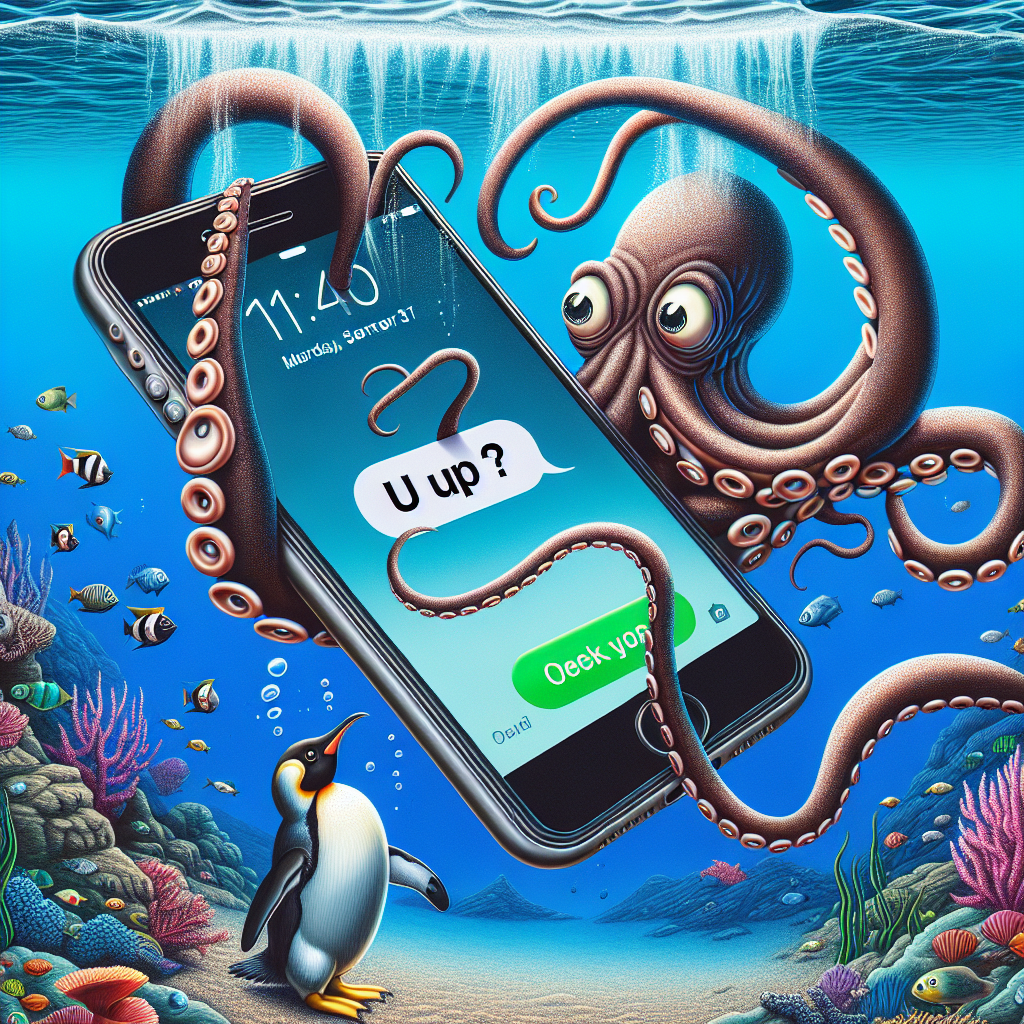 A Kraken dragging a penguin by its flipper while texting "u up?" on a giant iPhone, digital art.